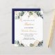Um fundo branco decorado com verde de eucalipto e folhas de ouro. Personalize e o nome e a cerimônia da criança. Letras pretas e ouros coloridas. Voltar: fundo azul marinho