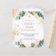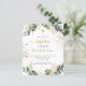 Um fundo branco decorado com verde de eucalipto e folhas de ouro e gotas falsas de ouro. Personalize e o nome e os detalhes da cerimônia. Letras pretas e ouros coloridas. Traseira: fundo branco com quedas de brilho de falso ouro