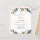 Um fundo branco decorado com verde de eucalipto e folhas de ouro. Personalize e o nome e a cerimônia da criança. Letras pretas e ouros coloridas. Voltar: fundo cor-de-rosa pálido