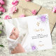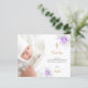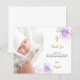 Um cartões de agradecimentos de batismo moderno e elegante. Um fundo branco chico decorado com flores roxas e brancas, flores. Personalize e adicione sua foto da criança, obrigado nota e nome.