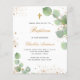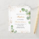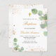 Um fundo branco decorado com verde de eucalipto e pó de ouro falso. Personalize e o nome e os detalhes da cerimônia. Letras pretas e ouros coloridas. Sexo neutro. Traseira: fundo branco com poeira brilhante ouro.