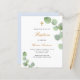 Um fundo branco decorado com verde de eucalipto e uma cruz de ouro. Personalize e o nome e os detalhes da cerimônia. Letras pretas e ouros coloridas. Fundo: fundo azul claro.
