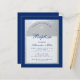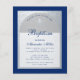 Um convite batismo recomendado para um garoto. Em um fundo retangular azul real, ele tem um arco azul-prateado falso que tem dentro azul sobre fundo branco. A palavra Batismo e o nome são escritos num guião caligráfico elegante; a primeira linha é o texto arquivado.
