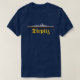 T-shirt with line drawing of the German battleship Tirpitz of the second world war, sister ship of the Bismarck, with the name of the ship written with fraktur letters.