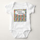 Este macacão-bebê tem um design Bauhaus de uma grade com quadrados e retângulos em vermelho, verde, azul, laranja, azul-claro, amarelo e vermelho.