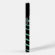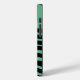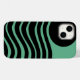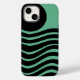 Esta capa de telefone tem o design de Bauhaus de linhas onduladas e círculos em preto num campo de verde-marinho.