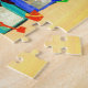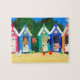 Um quebra-cabeça de serra com uma fileira de cabanas de praia coloridas e gaivotas, de uma colagem de papel pintada a mão por Judy Adamson. Outros produtos e cartões de saudação com este design estão disponíveis na minha loja.