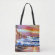 Pintura de uma praia ao amanhecer com pequenas ondas e gaivotas voando no colorido céu cor-de-rosa e laranja.