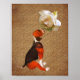 Um filhote de beagle bonito cheirando uma rosa branca delicada em papel de poster.