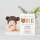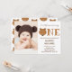 Nosso urso está fazendo um primeiro convite de aniversário para bebês com um modelo de foto. Este convite é castanho e branco, com a palavra "Um" em letras grandes, ilustrando o rosto de urso como primeira letra da palavra. Simplesmente, personalize este convite com a sua fotografia e informação, adicione-o ao seu carrinho e feliz aniversário ao seu bebê maravilhoso! Bear Foto Animal Primeiro Convite de Aniversário Design de Feriado | ©Melissa Patton — Artista/Ilustrator