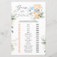 Este design apresenta um urso de pelúcia amigável com arco azul e balão cardíaco. Ele está cercado por folhagem verde. O texto "Adivinha os Recursos" está escrito em fontes modernas de caligrafia.