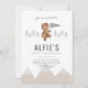Um urso de aquarela segurando uma bandeira com um número 'um', juntamente com árvores e montanhas ao redor da design. Perfeito para a sua Festa de aniversário temática da floresta montanhosa! Você pode alterar o 'um' no sinalizador para qualquer número e editar todo o outro texto.