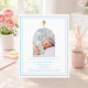 Um fundo branco, decorado com um quadro azul para bebê, e um ouro cruza Personalizar e adicione um nome de foto e detalhes. Texto azul. Quadro fotográfico em forma de arco. 1 folha = 1 convite impresso de borda a borda.