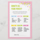 O jogo "O que há na sua bolsa" é uma atividade divertida para qualquer Chá de fraldas. Este cartão vem num esquema cor rosa, com um confete colorido. A adição perfeita a um Chá de fraldas ou a festa do Bebê Sprinkle! Encontre outros jogos e itens correspondentes em www.zazzle.com/mypartydesign