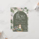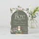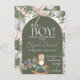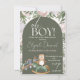 Um chá de fraldas giro de uma coruja bebê em um cavalo de balanço e um trem de choo em verde e pêssego e fundo branco com opções de personalização.