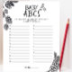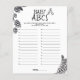 Parte da coleção do Bebê da Brewery, este Jogo do Bebê ABC é divertido para todas as idades! Apenas apareça com uma palavra por carta e a pessoa com mais vitórias! Você, o anfitrião, vai definir o tempo que os hóspedes têm para jogar. Todo texto é personalizável para corresponder aos detalhes da sua ocasião perfeitamente ↣ basta clicar no botão ‘Personalizar’.