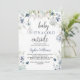 O convite para o chá de fraldas de inverno contém folhas e bagas verdes e azuis esmagadas que enquadram os detalhes da sua festa.