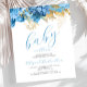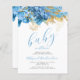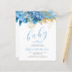 Este doce convite para chás de fraldas apresenta uma borda superior de flores azuis e douradas e folhagem. Abaixo, as palavras "baby in bloom" aparecem no elegante guião azul de escrita manual. Personalize o texto com o nome da futura mãe em um script azul e os detalhes em fontes serif de cinzas de carvão em um fundo branco.