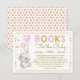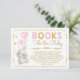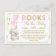 Um cartão de convite para "trazer um livro", com um adorável elefante bebê com balões em forma de coração, em cor de rosa e ouro, disponível em nossa loja!