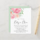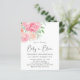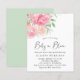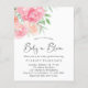Bonito convite para bebês, amigável ao orçamento, com flores cor-de-água rosa e coral e "Baby in Bloom" escrito em um roteiro de na moda.