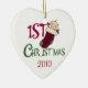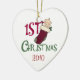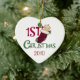 Uma adorável Enfeites de natal de 1rua de um bebê apresentando um bebê em uma estocagem de Natal e um texto vermelho e verde que diz "Natal de 1rua". Você pode mudar a data para o ano atual ou para o ano passado ou deixar a data completamente de folga!