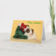 Fotografia de um bebê guincho descansando ao lado de um Natal empilhando com um arco vermelho, com as palavras "Feliz Natal", mostradas em um Cartão de Saudação.