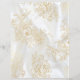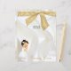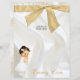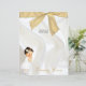 Linda menina com olhos castanhos em seu vestido batizante e colar de cruz dourado. O fundo é uma placa branca com um ornamento de arco de ouro.