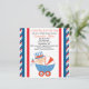 Foguetes & fogos-de-artifício! Há um bebê na maneira!! Comece sua celebração fora com este convite adorável do chá de fraldas. Tem a beira da bandeira dos Estados Unidos vermelha, a branca, e a azul abaixo de cada lado com o branco do centro. No centro inferior é um bebê bonito em uma re, carruagem branca, e azul vestindo um chapéu patriótico e guardarando a bandeira americana em sua mão. Personalize com sua informação do partido. Verifique para fora o outro design e cores que nós oferecemos. ilustrações do ©JW