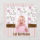 O primeiro convite de aniversário do bebê adorável, feito em um esquema de cores moderno, marrom, bronzeado, rosa e azul. Mão divertida desenhou padrões de listras e círculos de bolinhas como um fundo, com um campo de fotografia de área quadrada, para a fotografia do seu bebê. Personalize todo o texto na frente e atrás para a festa de aniversário memorável do seu filho.