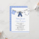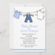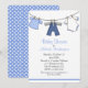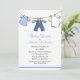 Convite para chá de bebê, com gráficos de roupas de bebê pendurados numa linha de lavagem, contra um fundo branco. Um azul com padrão de bolinhas branca, cobrir a parte traseira. Personalize todos os campos de texto para o evento do seu chá de fraldas.