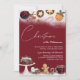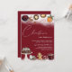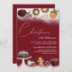 Uma festa de Natal ou convite de festas jante. Num fundo vermelho festivo com neve, são apresentadas comidas de Natal como vinho encharcado, tartes de picada, pão de gengibre, bolo de Natal e doces.