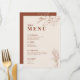 Este menu é caracterizado por estilo 'boho', trabalho de arte floral, terra neutra e cores beges, com uma mistura de diferentes estilos de fonte, muitas vezes em diferentes tamanhos, para criar um aspecto exclusivo e eclético que faz desses menus uma estética natural.