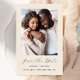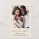 Este simples e minimalista Cartão Salvar a Data contém uma foto vertical acima das palavras "Salvar a Data" em um elegante roteiro de escrita manual dourada, seguido pelos nomes do casal, data do casamento e cidade em sans serif em um fundo bege. Adicione uma mensagem mais detalhada com informações adicionais sobre o contrário.