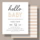 Convite personalizável, simples e moderno, de papel de chá de fraldas, com tons brancos e bege neutros. Com as palavras "olá, bebê" e risca bege e branco ao contrário.