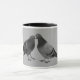 Esta caneca incomum do pássaro seria o presente perfeito para o romantics, os amantes, os fanciers do pombo e as pessoas que como algo que é apenas um pouco diferente ou subtil. O design na caneca é uma fotografia preto e branco original de dois pombos que smooching em um fundo cinzento. A caneca dos nossos amantes do pombo faria um aniversário perfeito, aniversário, casamento ou noivado atuais para o pássaro - fanciers, fanciers do pombo especialmente, e casais que amam a natureza. Você pode personalizar a caneca adicionando seu próprio texto - seu e seus nomes, por exemplo, um ou outro lado da fotografia. Você pode igualmente adicionar um fundo e uma beira da cor à caneca.