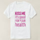 Declare as suas necessidades com uma dose de charme na nossa "Beije-me que é bom para a sua saúde". A mensagem ousada, mas simples, é reproduzida em uma fonte rosa, limpa e atraente que adiciona um toque de doçura e confiança ao seu estilo. É a camisa perfeita para aqueles que acreditam que um beijo é o remédio mais doce e uma maneira simples e na moda de mostrar uma personalidade divertida.
