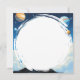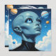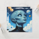 Cartão de vazio de ufologia. Uma bela alienígena extraterrestre fêmea com grandes olhos azuis olhando para o espaço nas estrelas e nos planetas.