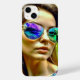Arte de IA legal representando uma bela senhora usando óculos de sol com um reflexo colorido e cercada pela natureza e flores.