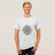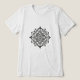 The design presents a symmetrical one, reminiscent of a mandala, rendered in a black and white palette. The central focus is a complex, circular arrangement of geometric shapes and mechanical elements, primarily gears, with each component meticulously detailed.
