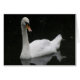Este cartão bonito mostra uma fotografia de um lindo cisne branco. O cisne é um cisne macho, pode-se dizer que é macho pela batida negra no bico. O cisne está deslizando graciosamente através da água em um lago calmo.