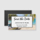 Um casamento salva a cartão de visita magnética da data. Personalizado com os nomes da noiva e do noivo, data do casamento e local. Uma cena de praia tropical idílica. Água clara de cristal azul turquesa e uma praia arenosa castanha macia. Algumas folhas de palma penduradas de cima. Um velho barco a remo de madeira fica sentado na praia. Uma paisagem serena e pacífica.