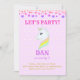 Belo Convite de Aniversário do Unicórn. Cabeçalho de bolinhas de cores múltiplas, unicórnio com três cores e arco-íris e padrão de estrelas em fundo violeta. O verso tem bolinhas de várias cores e o número 3 que também pode ser personalizado em fundo violeta. Todos os textos e números podem ser personalizados.