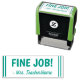 Este design de carimbo divertido apresenta a mensagem encorajadora "FINE JOB!" e o nome de um professor personalizado. Ele poderia ser usado por um professor, educador, ou tutor ao marcar tarefas, para reconhecer que um aluno fez bem.