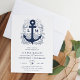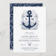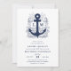 Convites náuticos encantadores apresentam uma ilustração de âncora desenhada à mão em azul marinho com suas iniciais em dentro. Personalize com seus detalhes de casamento em marinho azul. Convites invertendo um padrão de corda náutica de loop em branco no marinho. Estilos alternativos disponíveis em nosso compro.