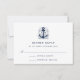 A placa RSVP de estilo costeiro apresenta a data de resposta desejada e a formulação de aceitação/recusa personalizada em azul marinho, completada com uma ilustração de âncora desenhada manualmente com as suas iniciais em dentro. Cartões invertidos para um padrão de corda náutica de loop branco em azul-marinho.