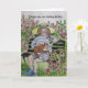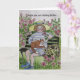 Desenho original de uma senhora enérgica e caprichosa, com uma mensagem de boas intenções.... Uma mulher alegre sentada num banco de jardins cercada por arbustos de rosa e segurando seu gato no colo. Ela está enviando uma mensagem para ficar bem. A dentro tem uma mensagem doce que colocaria um sorriso no seu rosto.