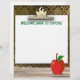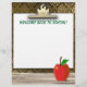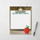 Papel de carta personalizado e bonito em um clipe de ouro pendurado em papel de parede damasco que diz "Bem-vindo de volta à escola!" em texto verde. Ou, simplesmente, deixe de fora o texto, apagando-o. Uma maçã vermelha com ilustração verde em folha sobre uma mesa de madeira está no canto inferior. Muito espaço de cópia a ser gravado mais tarde. Excelente de presente pessoal para professores, médicos, enfermeiros, profissionais de saúde, etc. Lembre-se, "Uma maçã por dia, mantém o médico longe!"