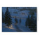 Nesta cena fantasiosa de uma noite de inverno, um caminho gelado leva entre derivas de neve pela colina e pelo rio até uma cabana acolhedora com velas na janela. A trilha e as pedras do outro lado da água são iluminadas por lanternas brilhantes, e uma fogueira ao lado do caminho envia faíscas para o ar frio da noite.