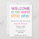 Um convite para chás de fraldas bonito em texto colorido com o bolinhas design no verso.