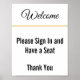 'Bem-vindo' aparece em um roteiro preto elegante no topo deste poster de negócios branco. 'Por favor, entre e tenha um assento obrigado' aparece em texto branco na parte inferior. As linhas de ouro falsas não são feitas de folha.